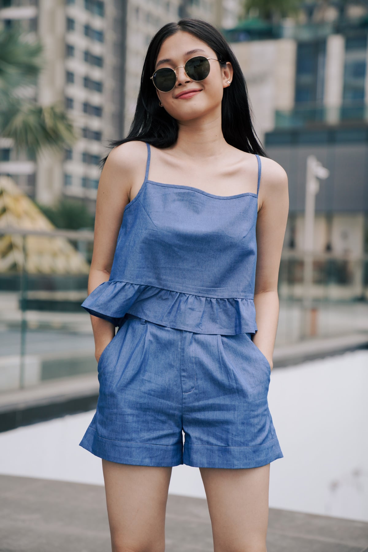 Tên sản phẩm: Áo 2 dây suông denim xanh dương nhạt phối bèo lai.