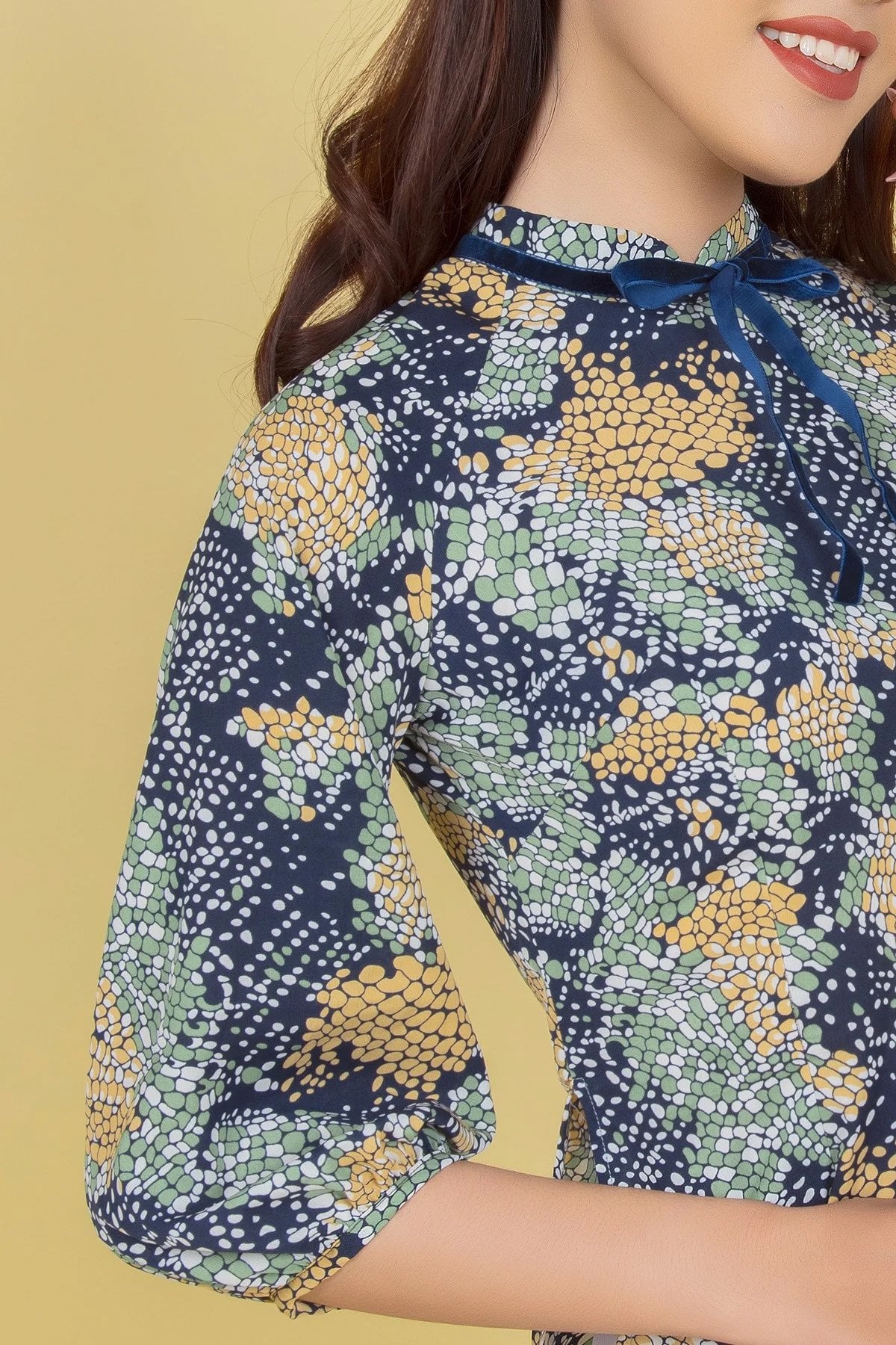 Tên sản phẩm: Áo dài ôm lụa in họa tiết xanh phối nơ cổ