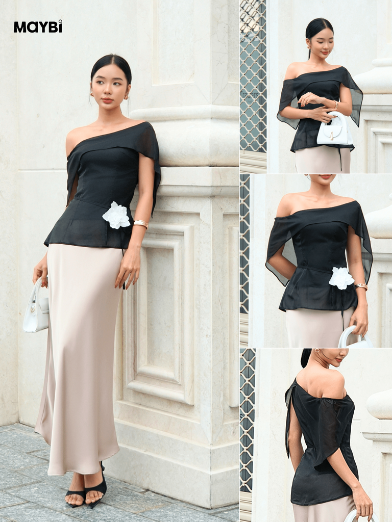 Tên sản phẩm: Áo kiểu bẹt vai tằm ánh đen kèm thắt lưng hoa