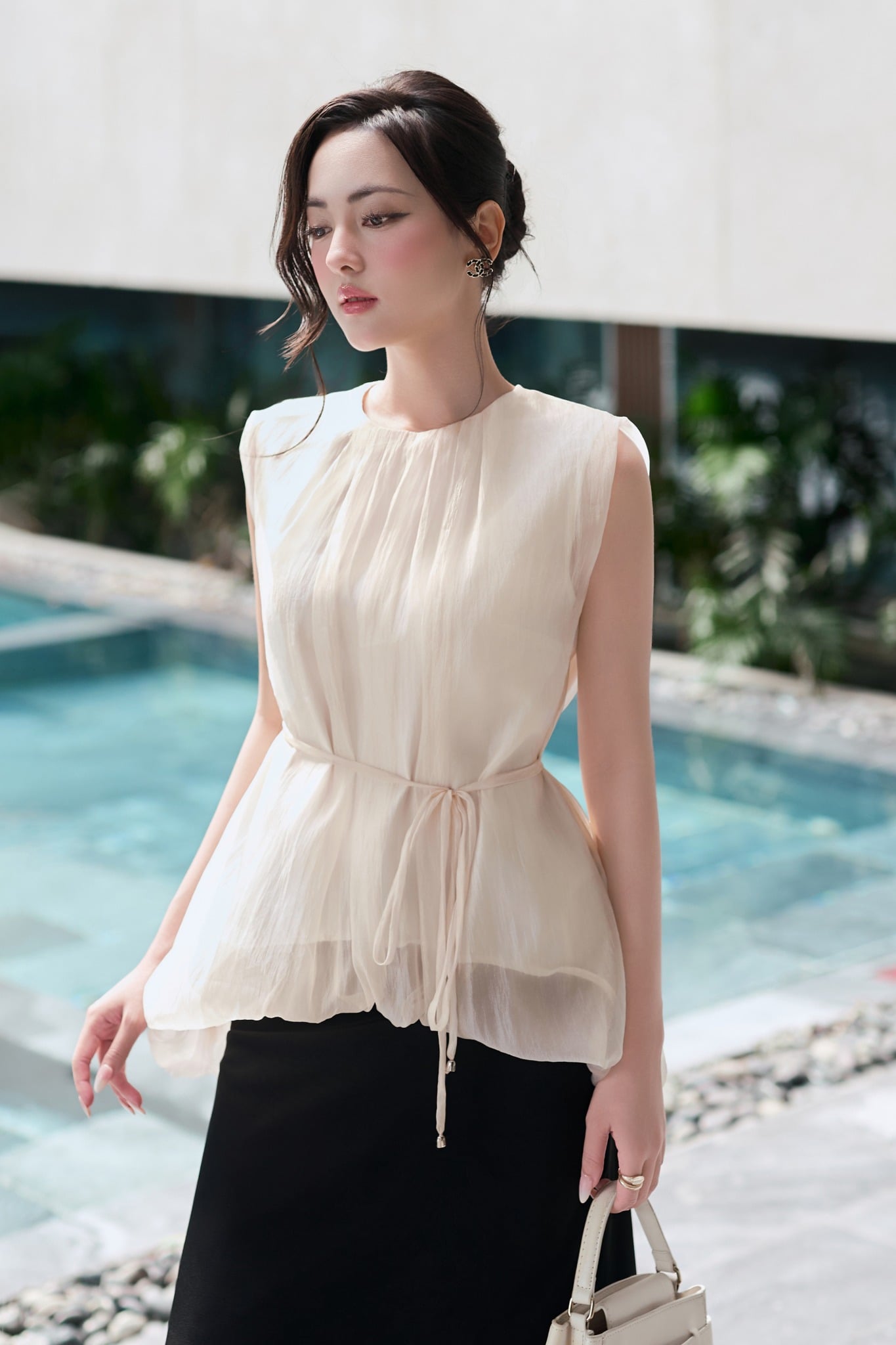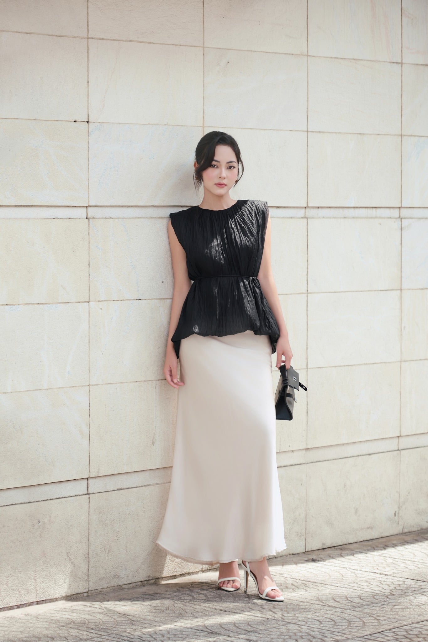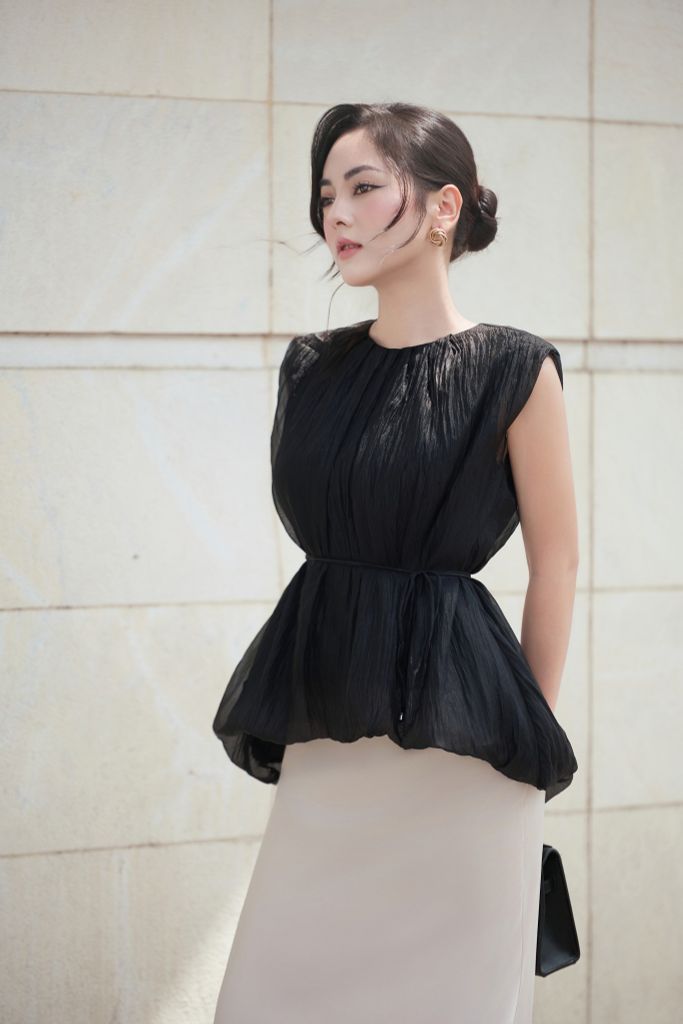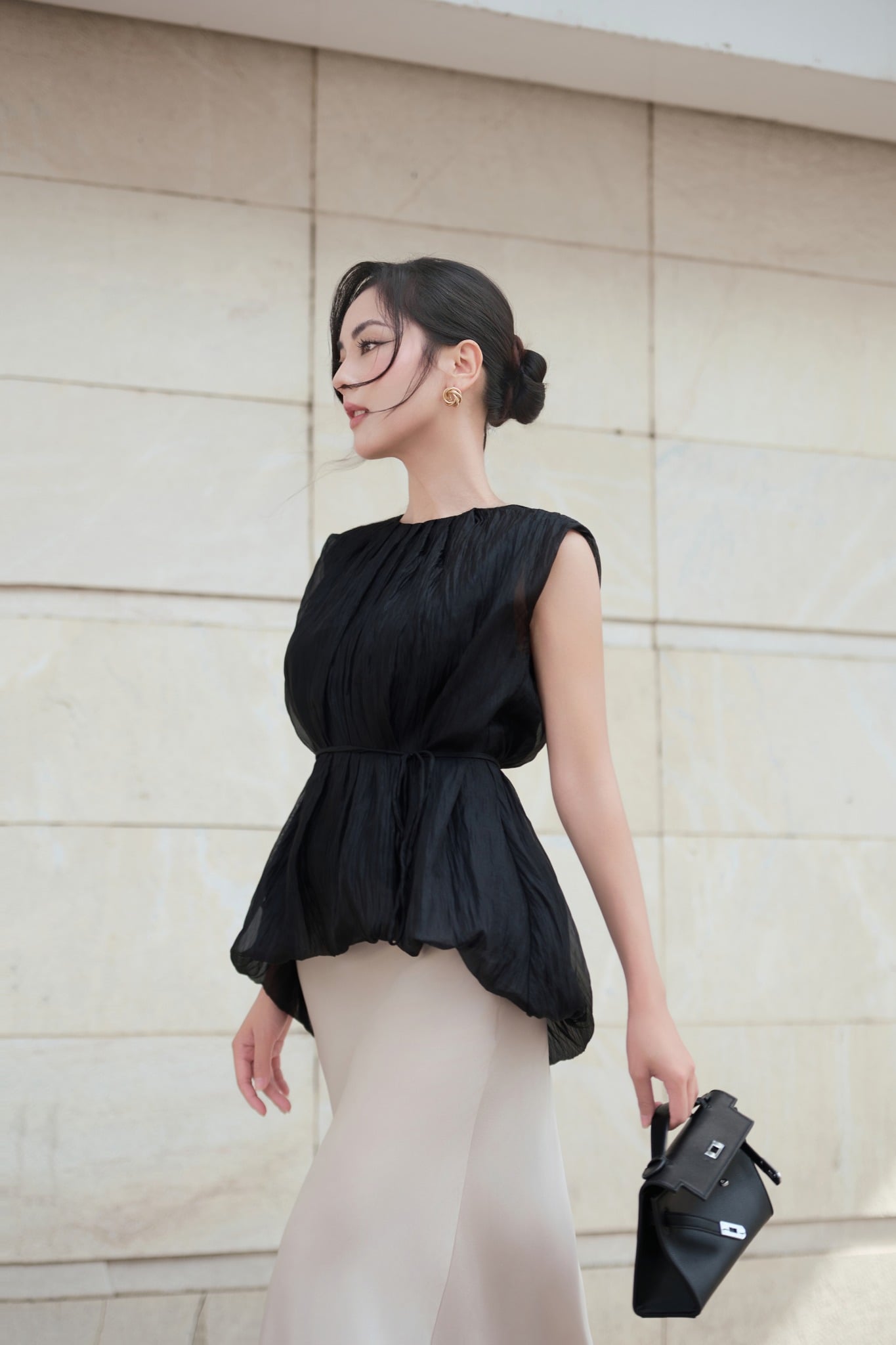 Mô tả kiểu dáng: Áo dáng rộng, tay bồng nhẹ, tùng bí phồng tạo hiệu ứng bồng bềnh sang trọng. Cổ tròn tối giản, dễ phối đồ.