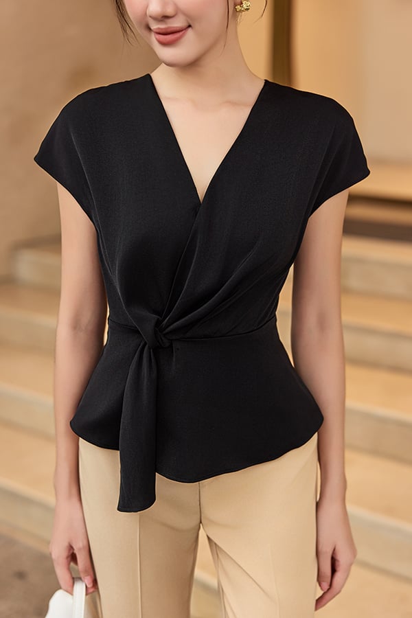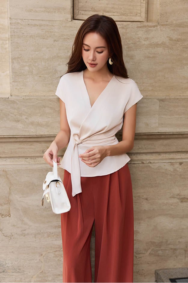 Mô tả kiểu dáng: Áo dáng chiết eo nhẹ, đắp tà cột ngang eo