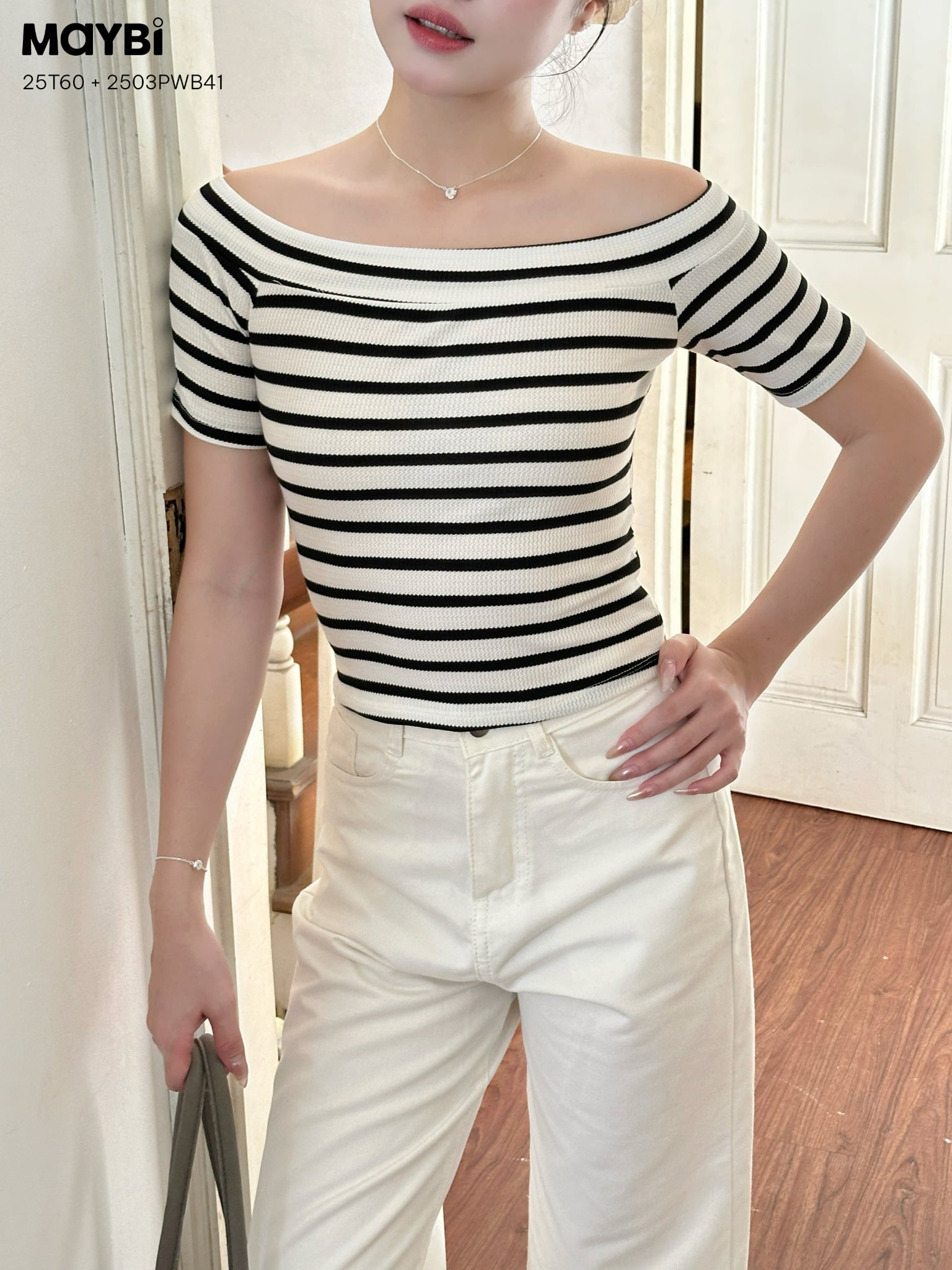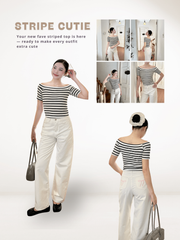 Áo thun ôm sọc trắng đen bẹt vai là một item linh hoạt, có thể đồng hành cùng nàng trong nhiều dịp khác nhau: