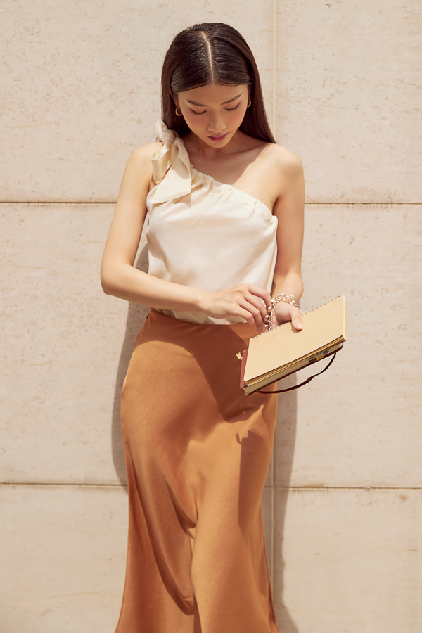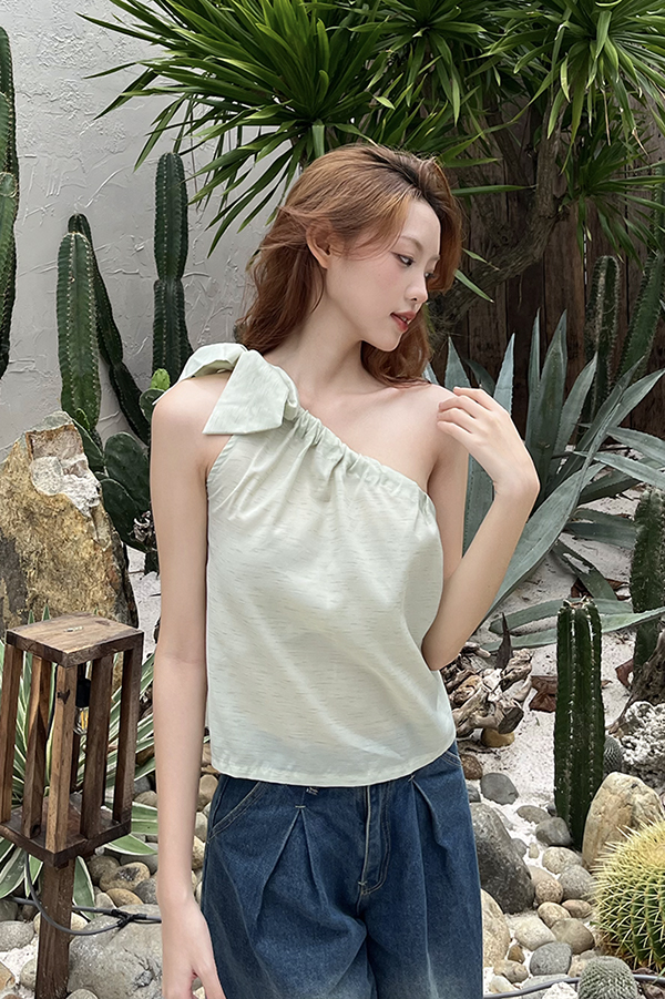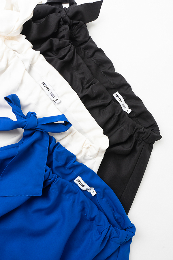 Form: Áo không tay, phối dây rút nhún cột nơ chéo bên vai, form rộng.