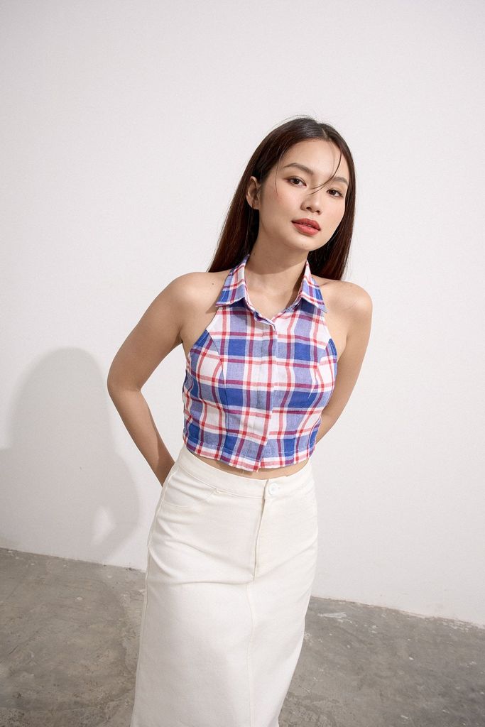 Form: Áo sơ mi croptop, khoét lưng sâu, không tay, gài nút trước, nẹp khuy nút ẩn.
