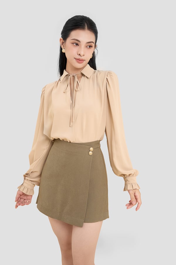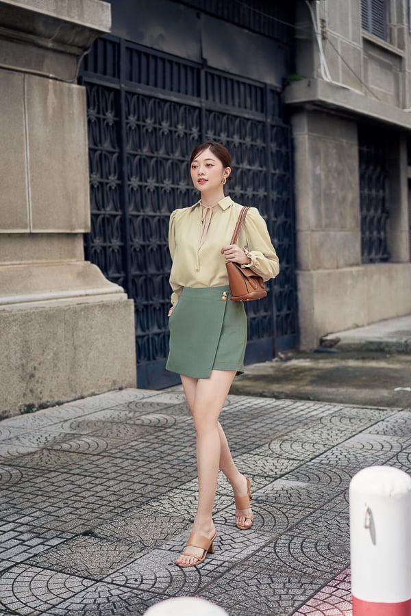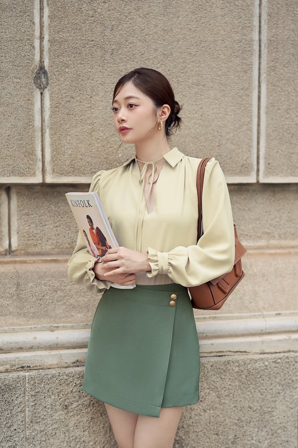 Form: Áo kiểu form rộng, cổ sơ mi, nhún vai, tay phồng lớn, có bèo tay.