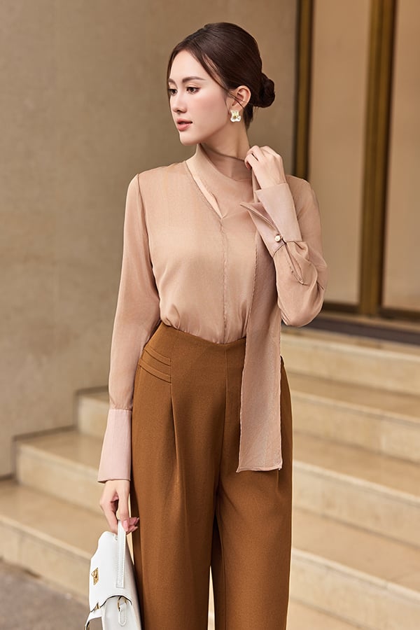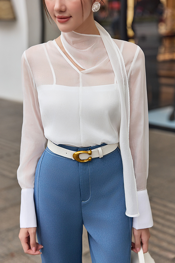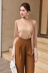 Mô tả kiểu dáng: Áo sơmi dáng rộng, xuyên thấu, cổ liền khăn