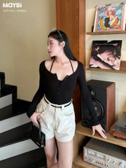 Mô tả kiểu dáng: Áo thun ôm, dài tay, cổ xẻ gài nút, kèm áo quây hai dây bên trong
