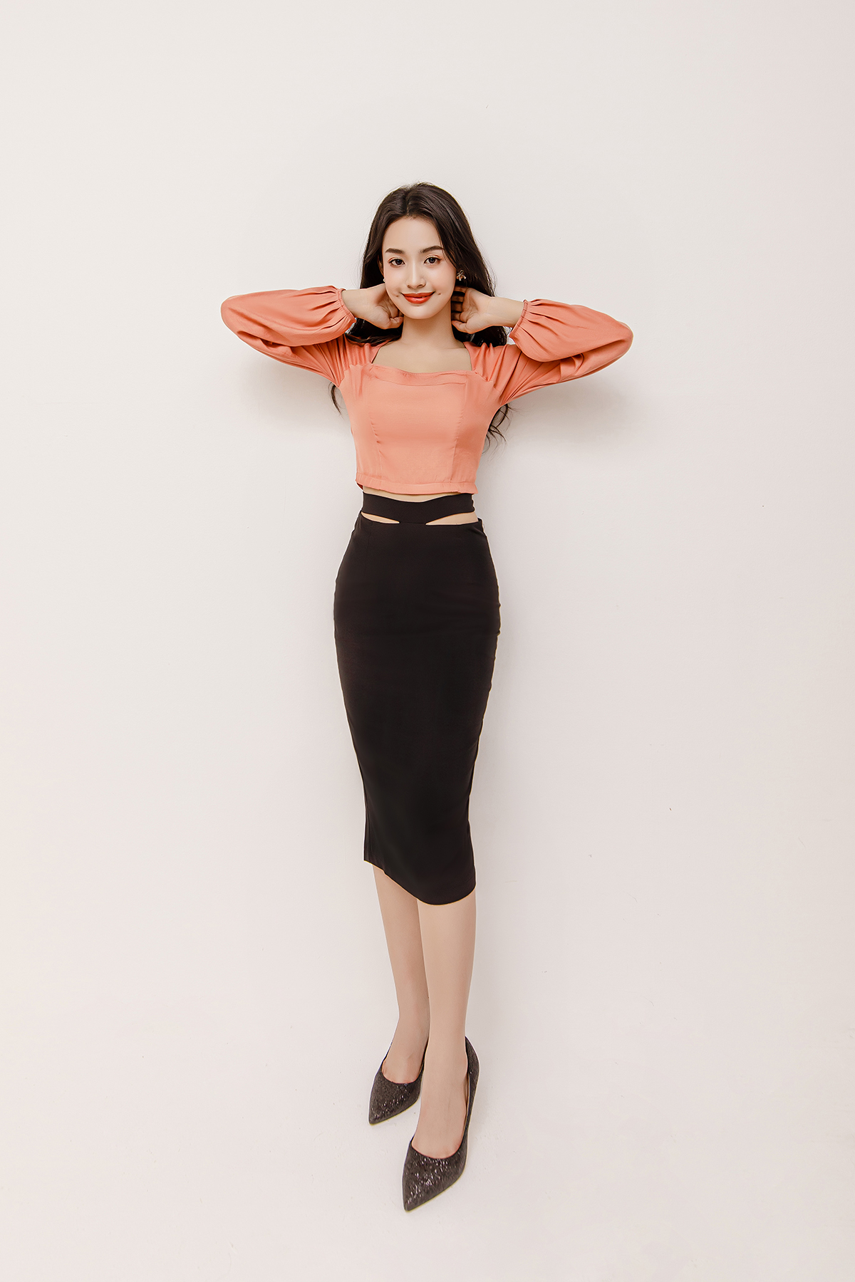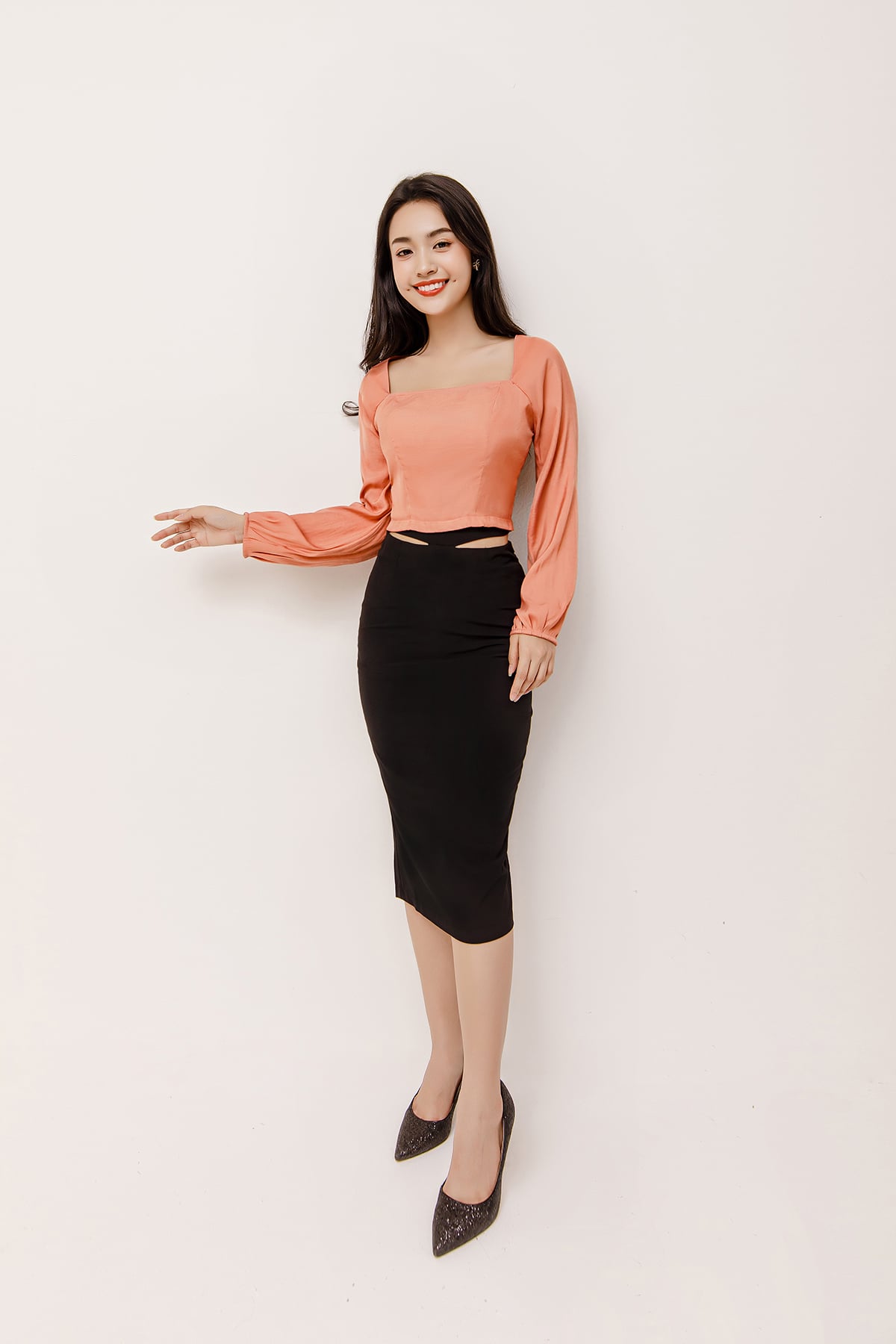 Form: Chân váy dài, suông, phối cột nơ ở eo, dây kéo sau.