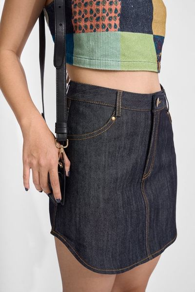Form: Chân váy jean lưng tây có passant, lai đánh cong 2 bên sườn váy, có túi.