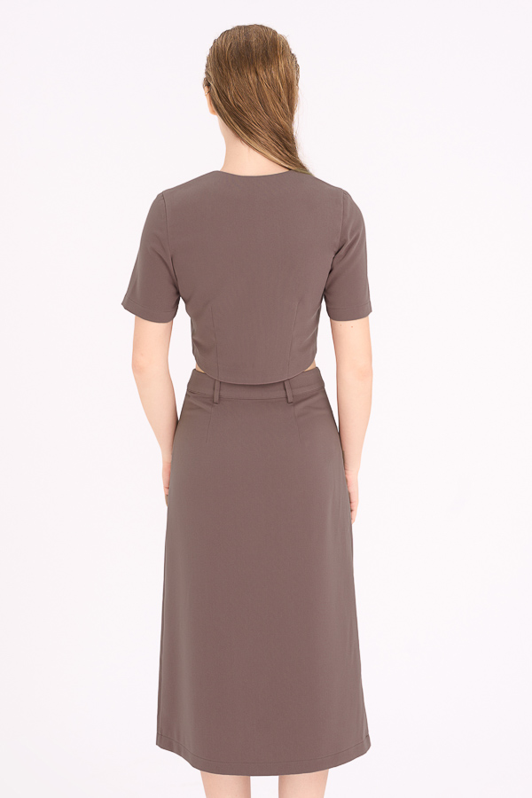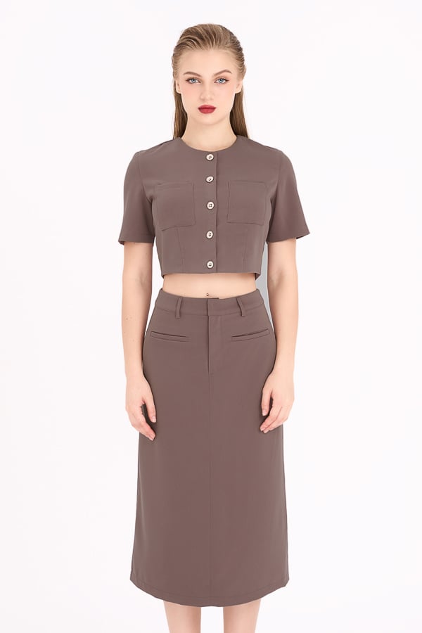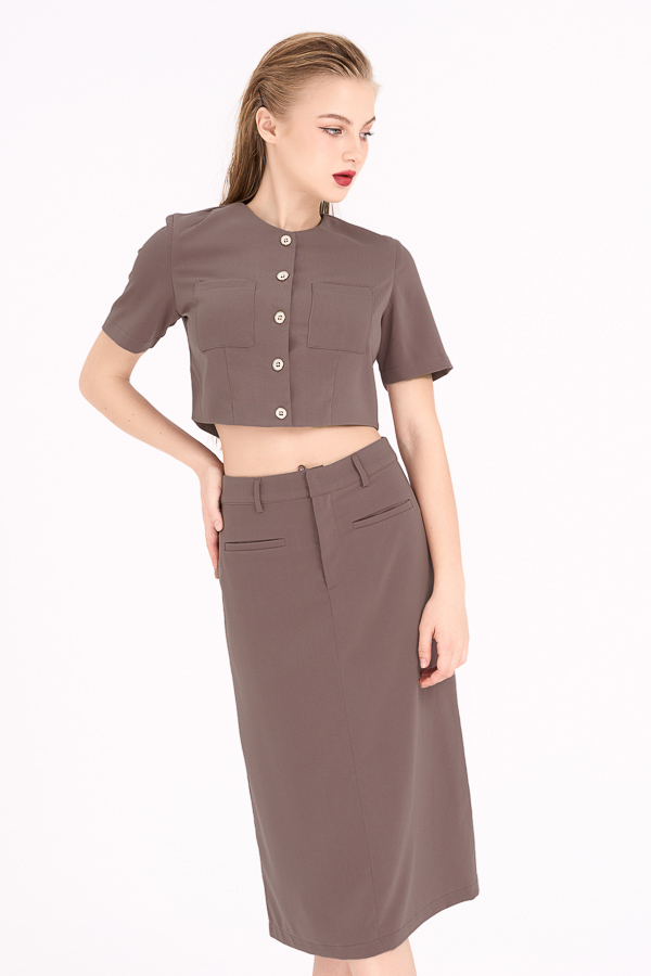 Form: Chân váy midi form A lưng tây, có túi mổ trước.