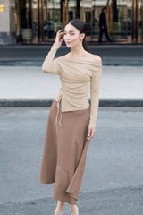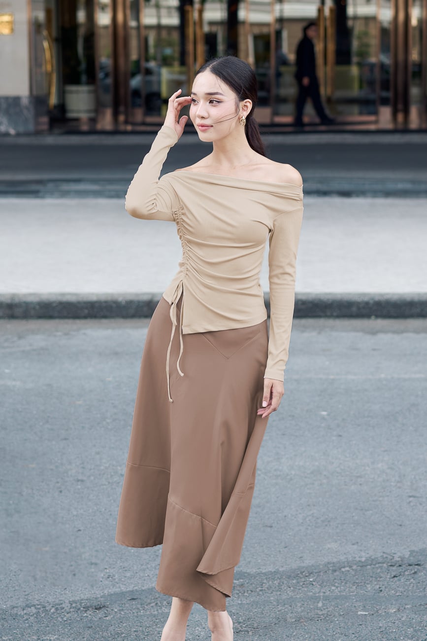 Form: Chân váy midi form xòe, rã kiểu, dây léo sau.
