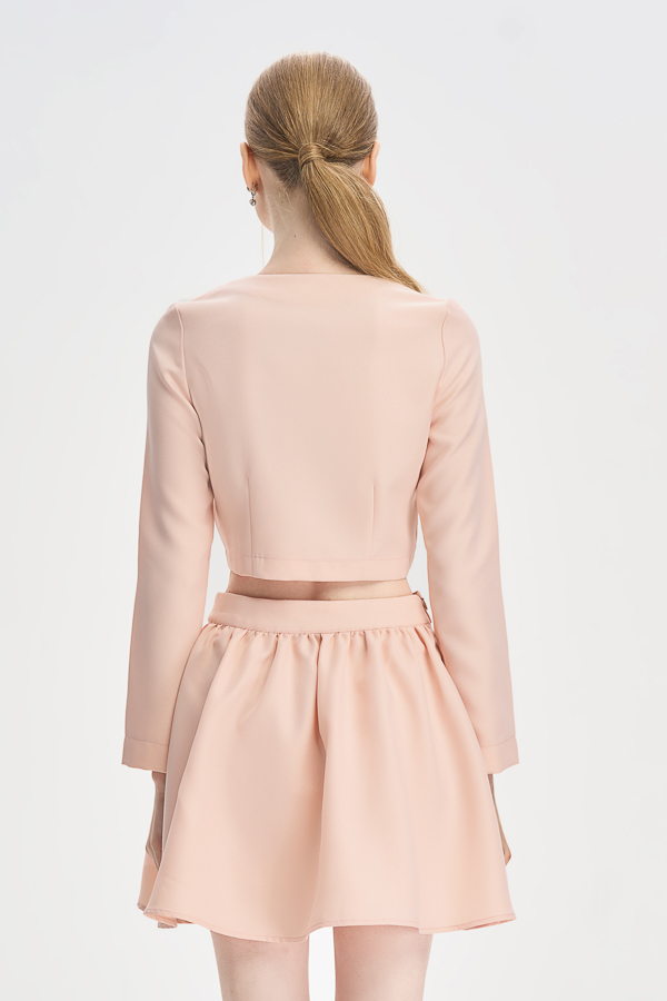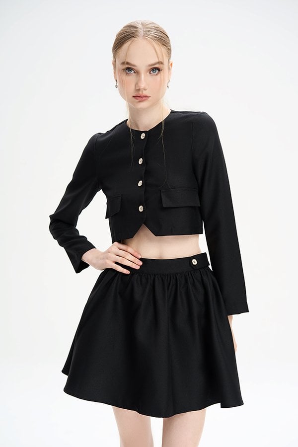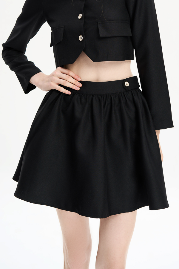 Form: Chân váy mini xòe, nhún tùng, dây kéo sườn, có nút trang trí.