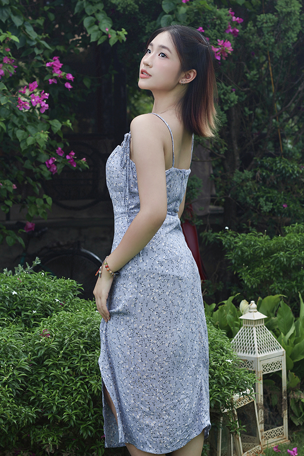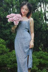Tên sản phẩm: Đầm 2 dây ôm linen in hoa nhí nền xanh xẻ tà