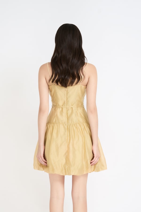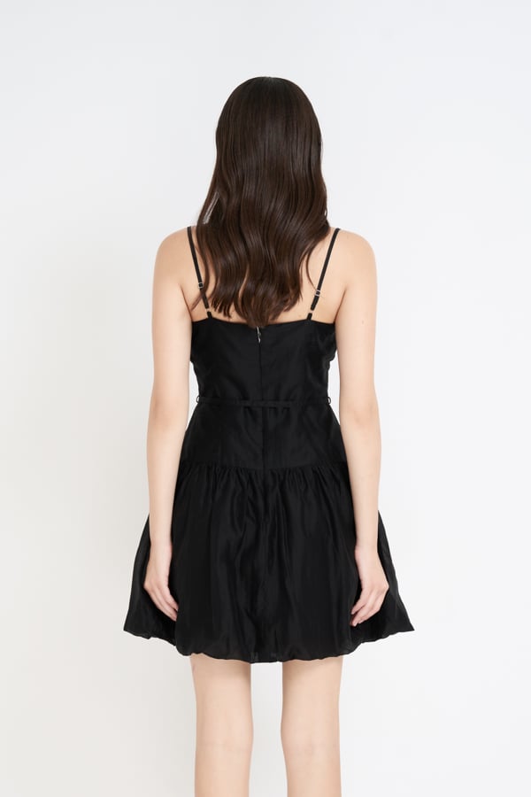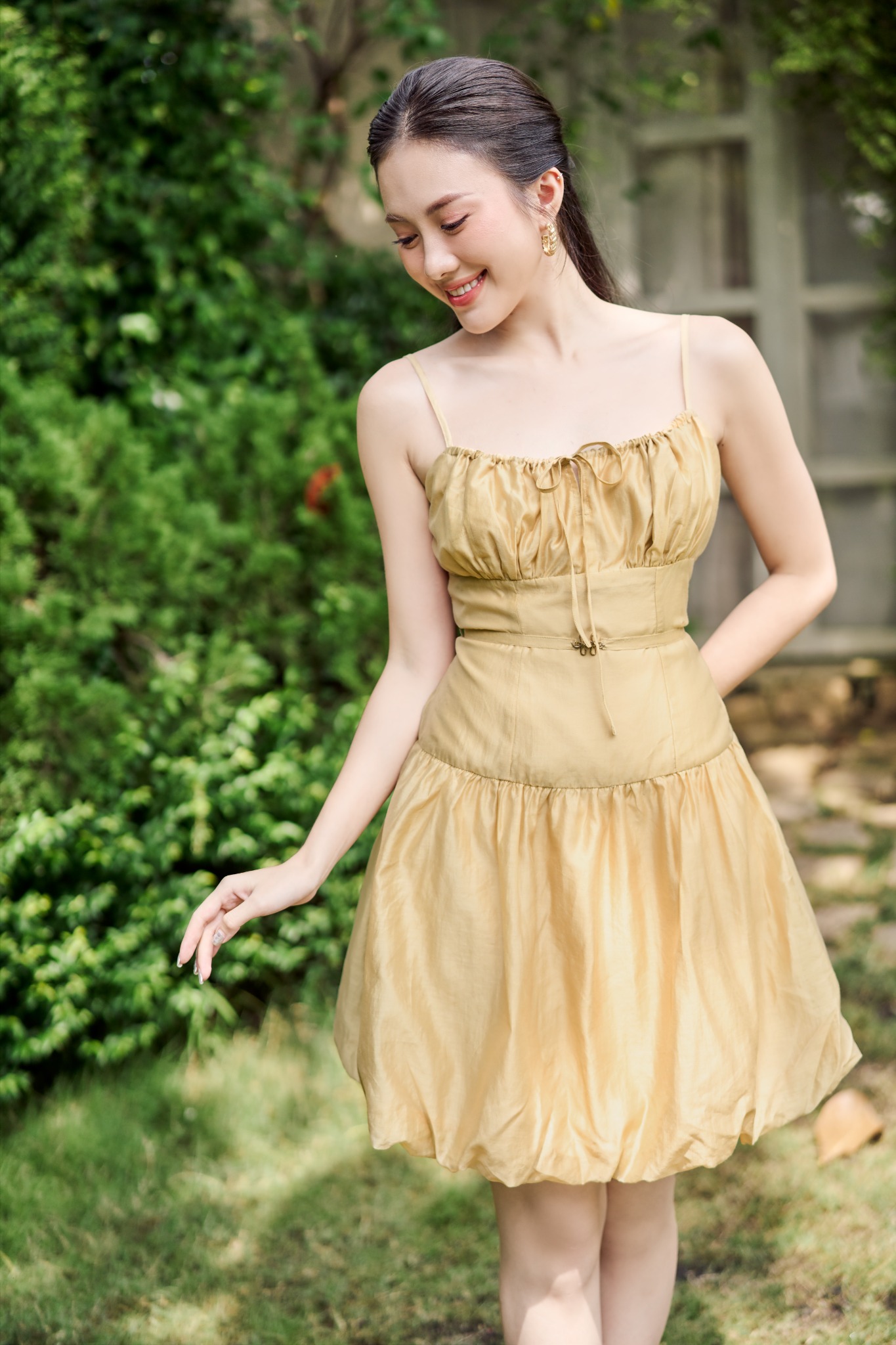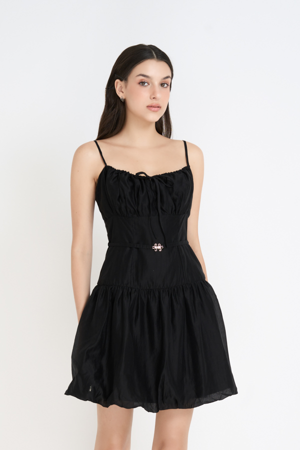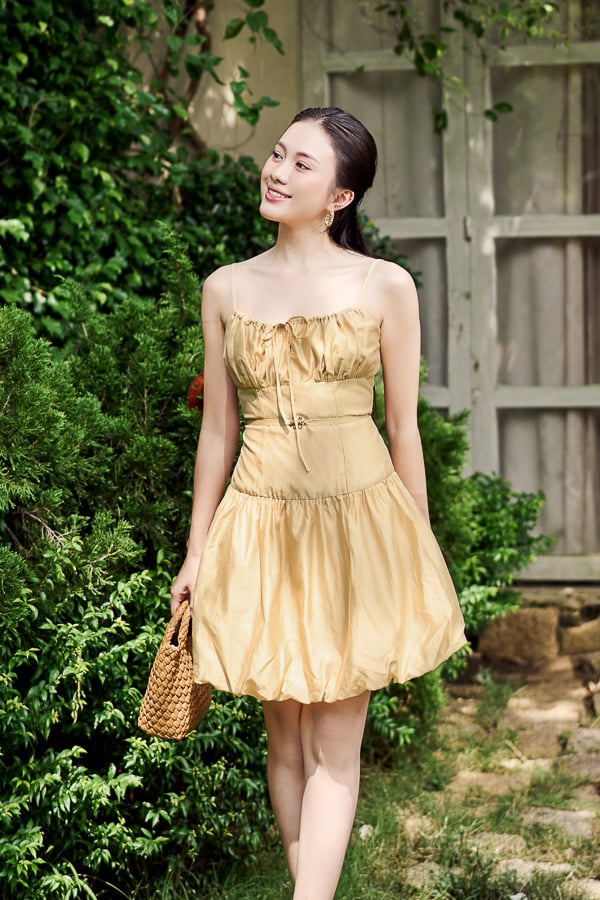 Form: Đầm bí 2 dây, nhún cup ngực, có phối nơ cột, dây kéo sau.