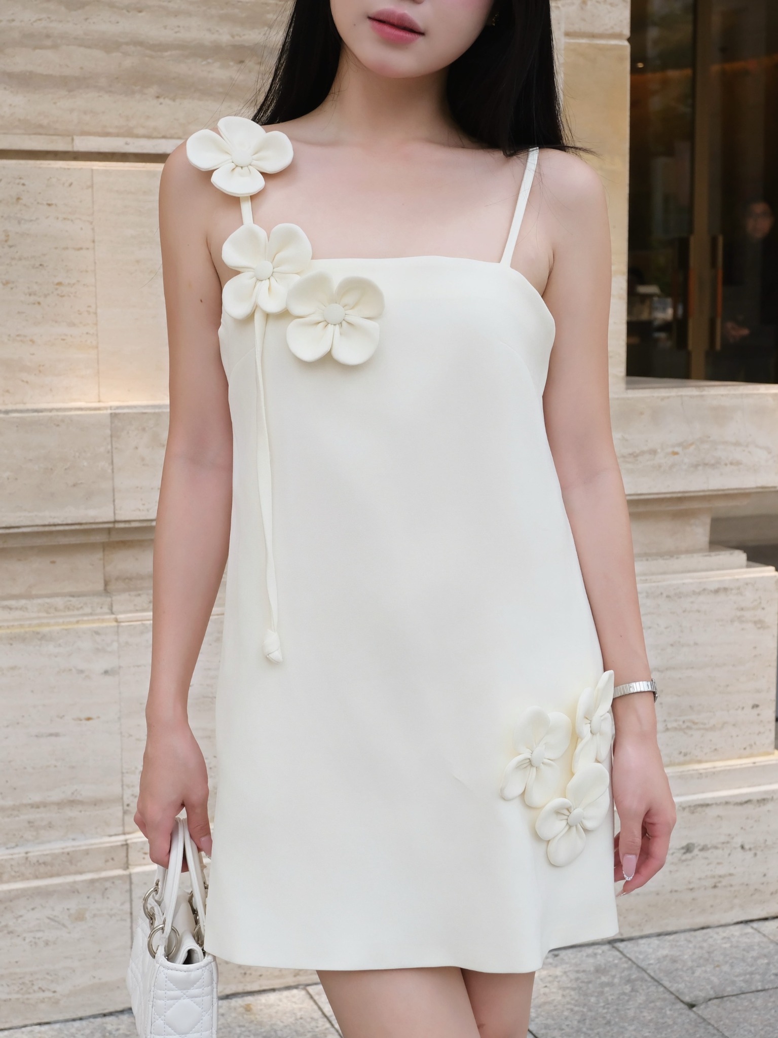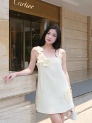 Mô tả kiểu dáng: Thiết kế đầm mini hai dây thanh mảnh, form suông nhẹ giúp tôn dáng và che khuyết điểm hiệu quả. Điểm nhấn nổi bật là chi tiết hoa 3D đính thủ công dọc thân váy và vai, tạo cảm giác nữ tính, sang trọng nhưng vẫn hiện đại. Độ dài trên gối giúp tổng thể trẻ trung, hack dáng tối đa.