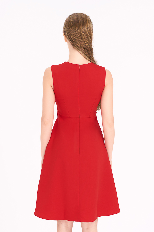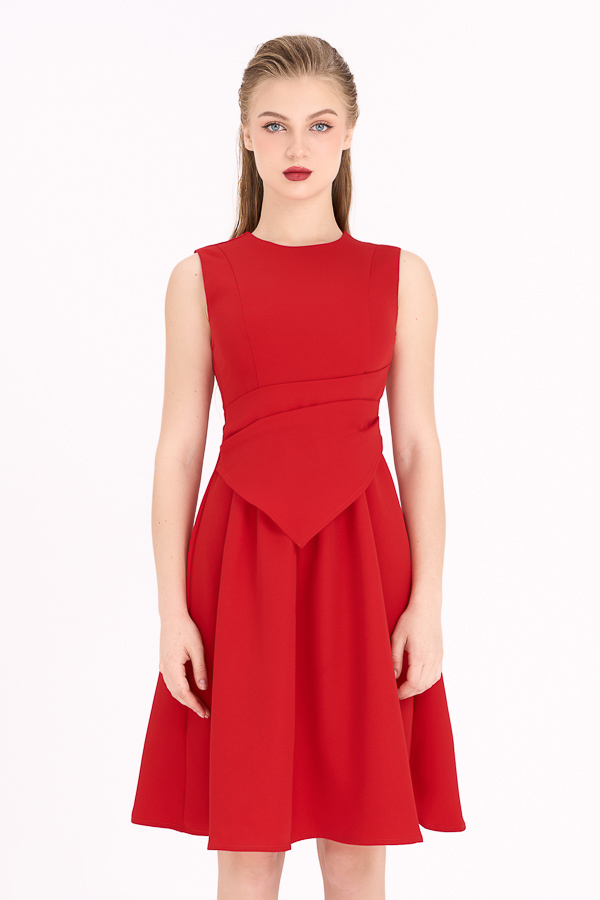 Form: Đầm midi form xòe, cổ tròn, không tay, có đắp trang trí xếp ly eo, dây kéo sau.