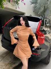 Đầm xoè mini, dáng A, thiết kế cổ lệch, tay áo loe, xếp ly eo, phối ghim cài trang trí