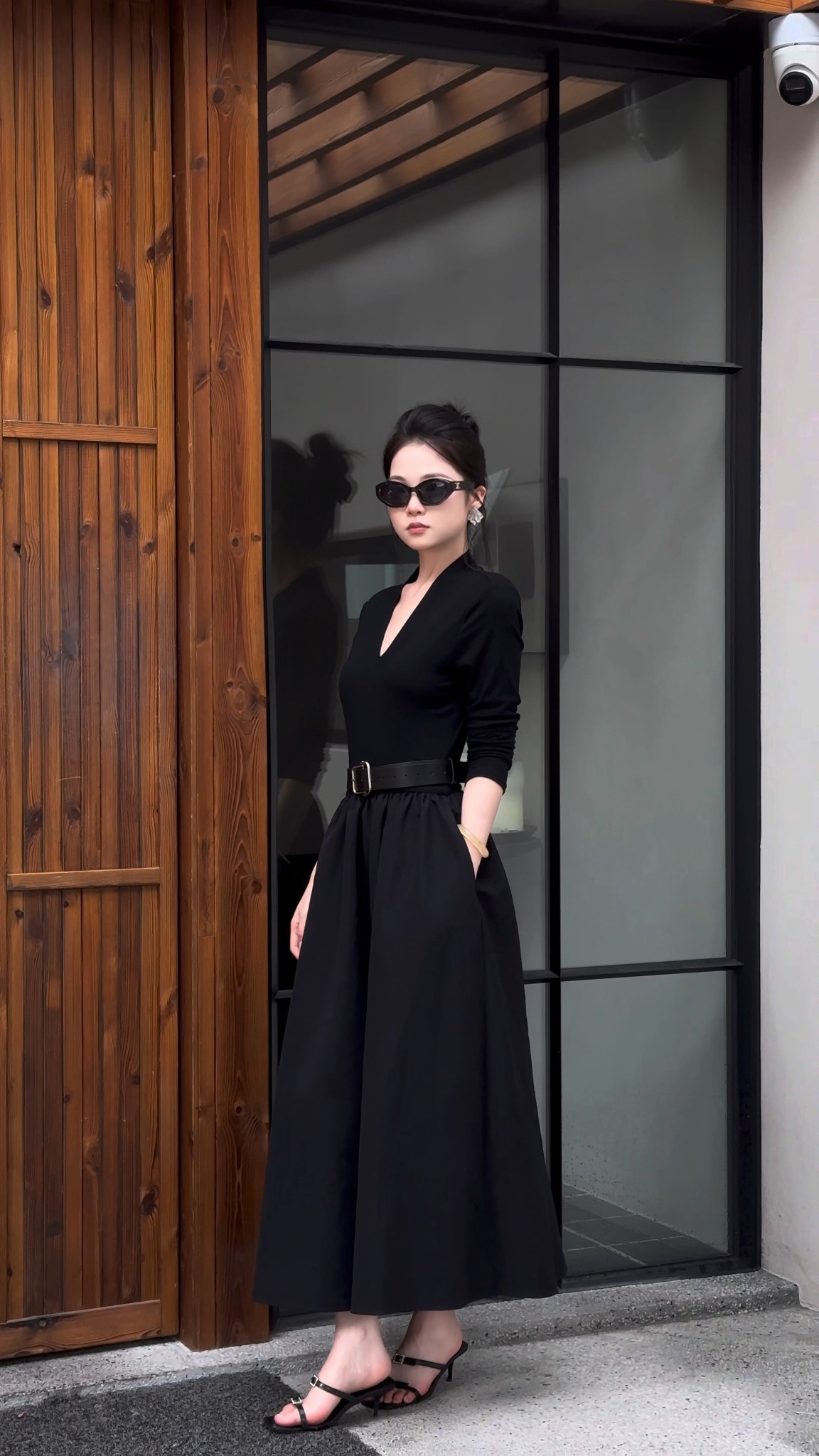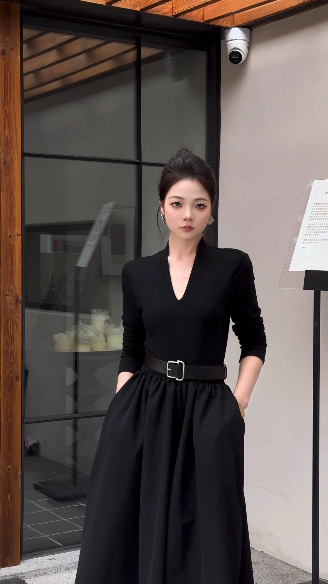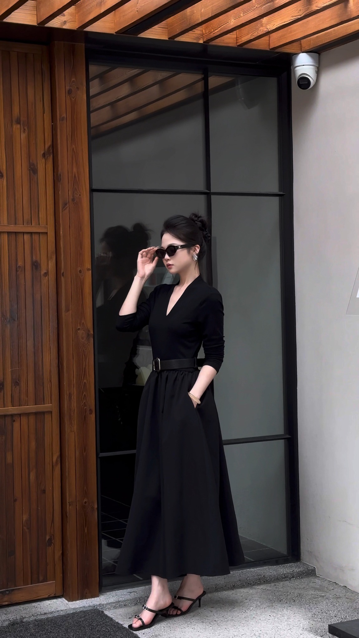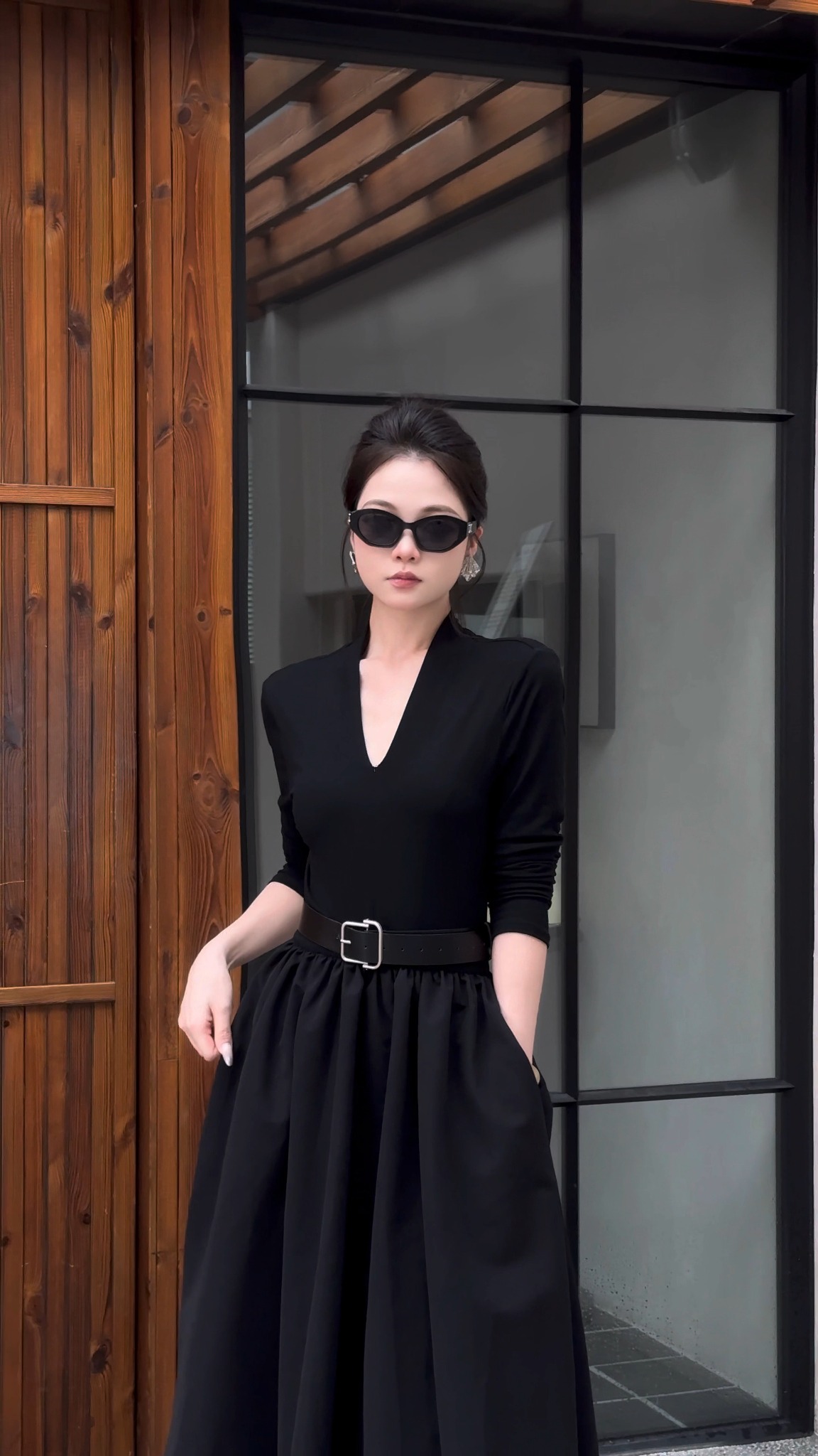 Tên sản phầm: Đầm nhún xòe cổ V dài tay dáng midi