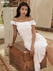 Đầm Ôm Ren Hoa Nổi Trễ Vai Tà Xéo Dáng Midi – Thanh Lịch Và Gợi Cảm