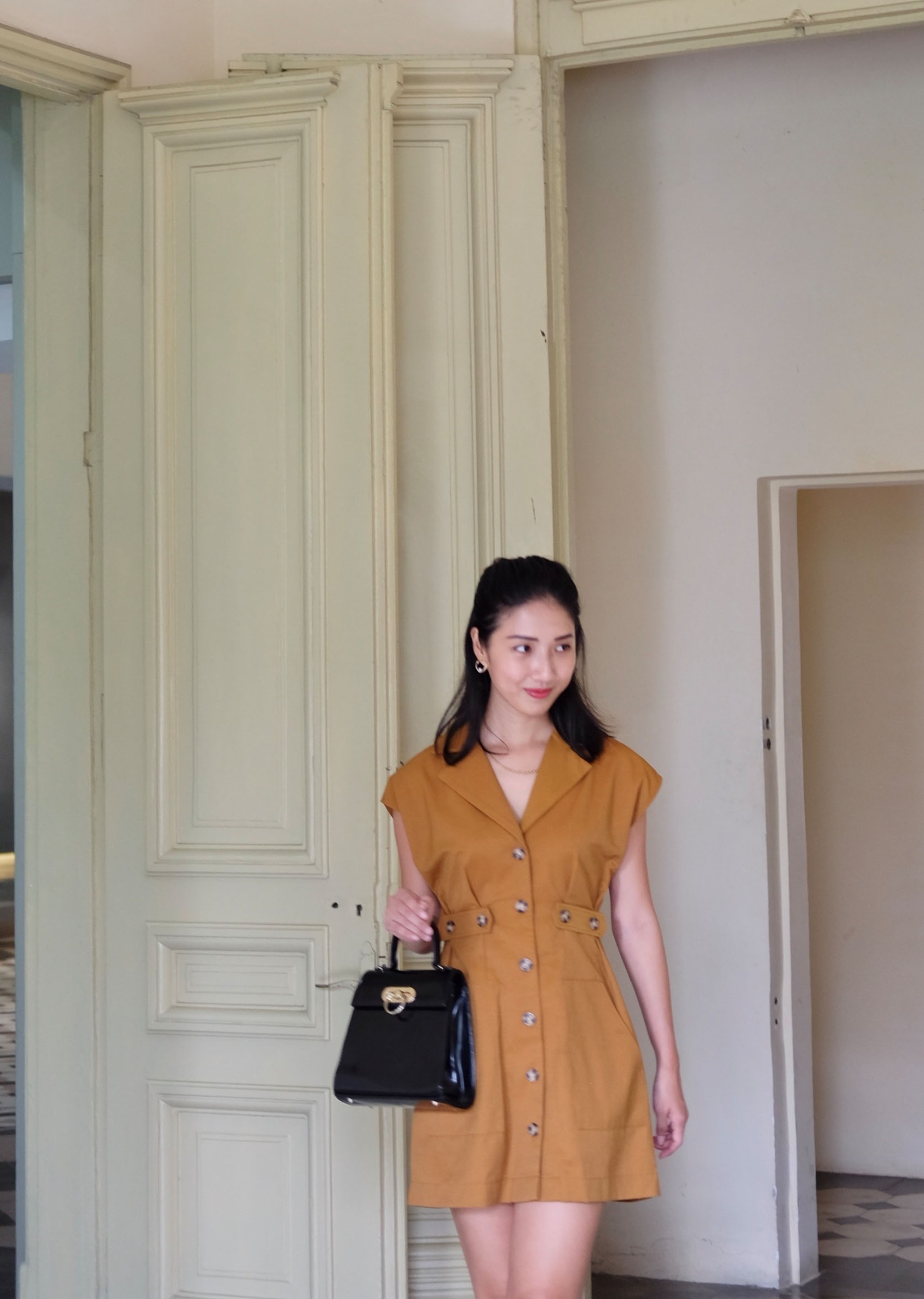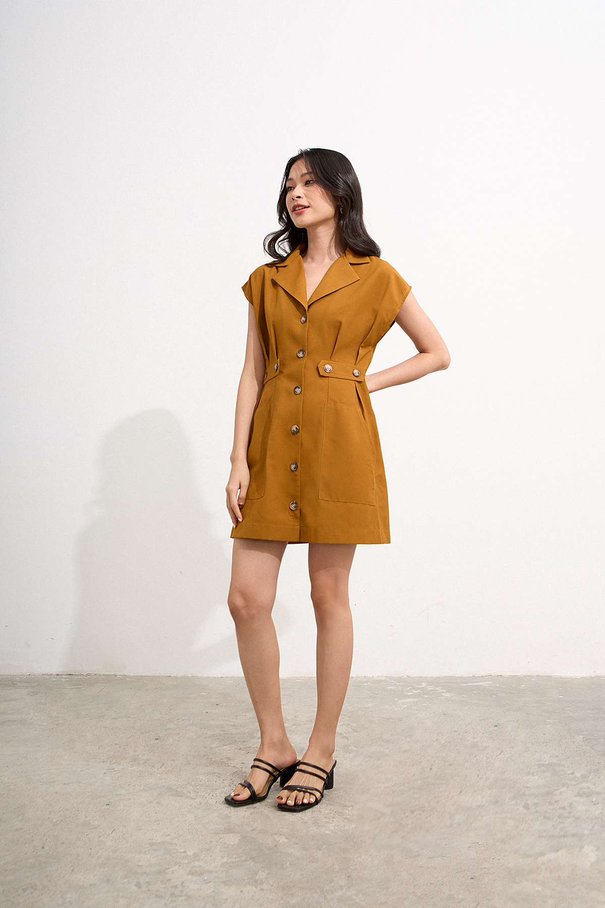 Form: Đầm giả vest vai rộng, không có tay áo, có phối đai eo, gài nút trước, tùng đầm A nhỏ không xòe ngắn ngang đùi.