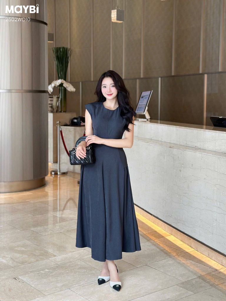 Mô tả kiểu dáng: Đầm xòe dáng midi, tùng rã nhún, có đệm vai, không tay