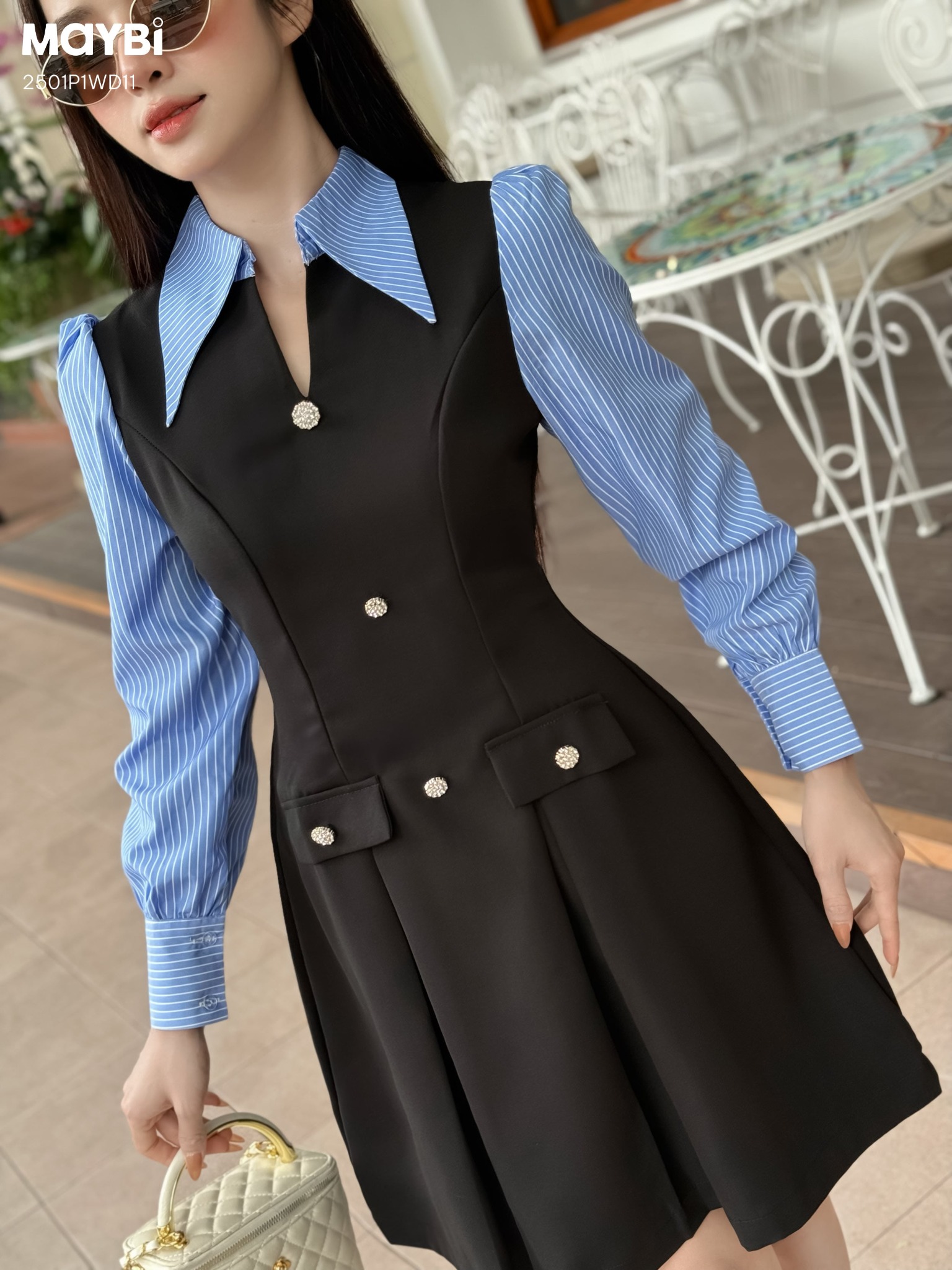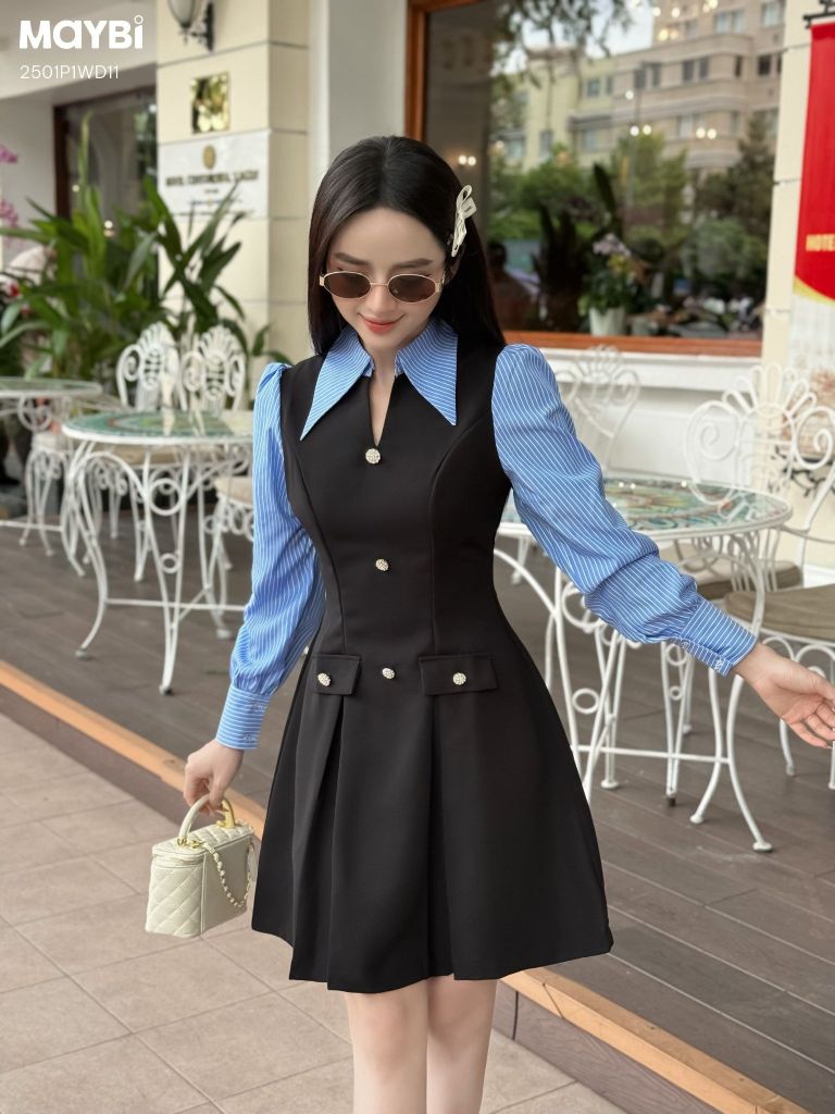 Mô tả kiểu dáng: Đầm mini ôm, tùng xếp li xòe phối tay dài, cổ sơ mi