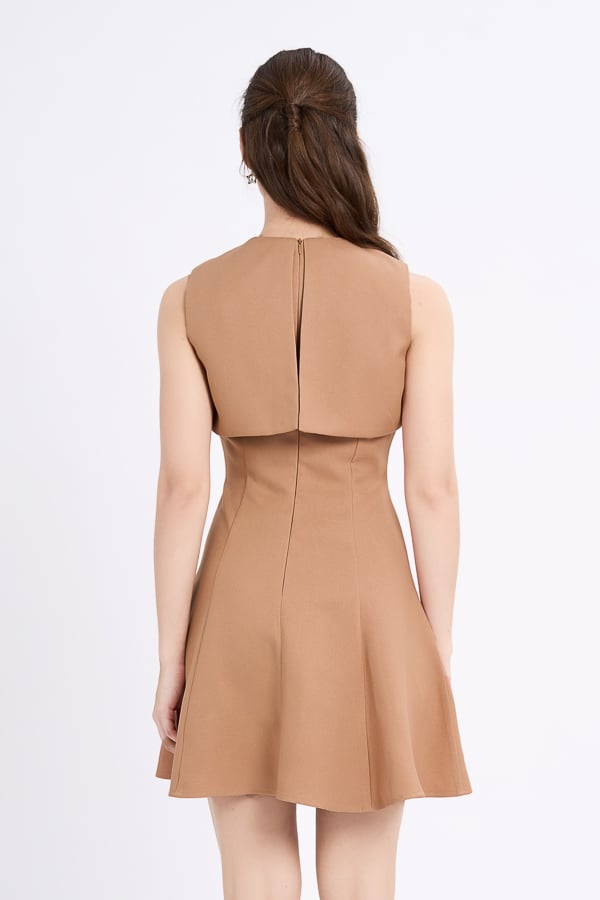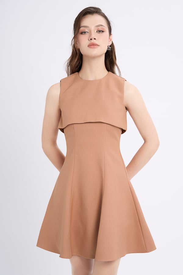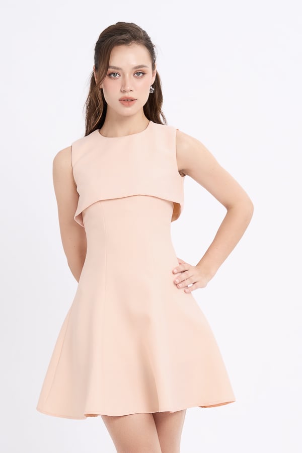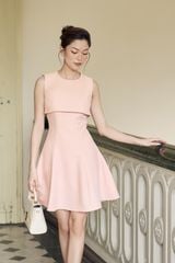 Form: Đầm xòe cổ tròn, không tay, thân trên phối miếng đắp kiểu, dây kéo sau.