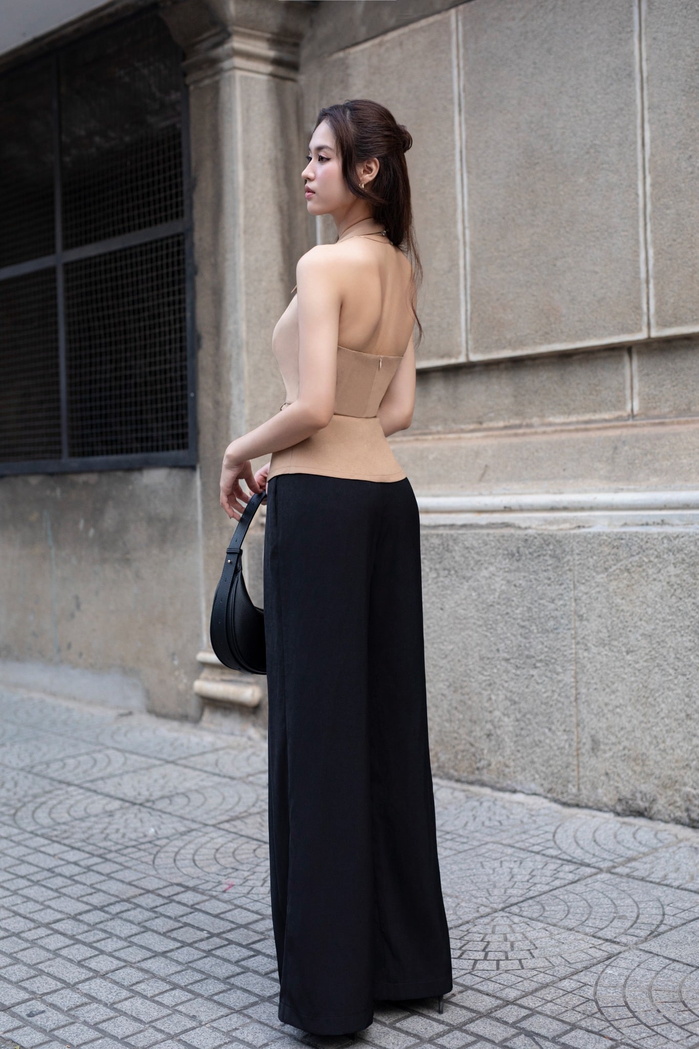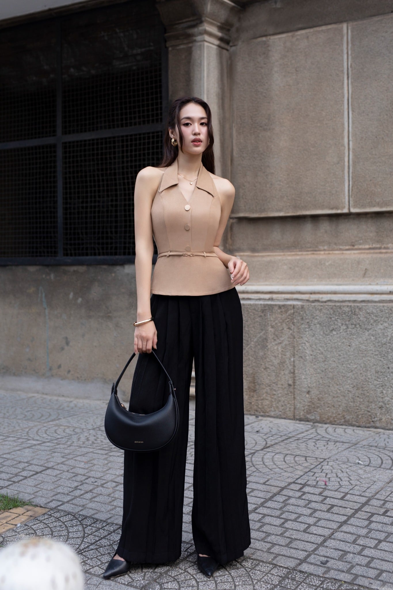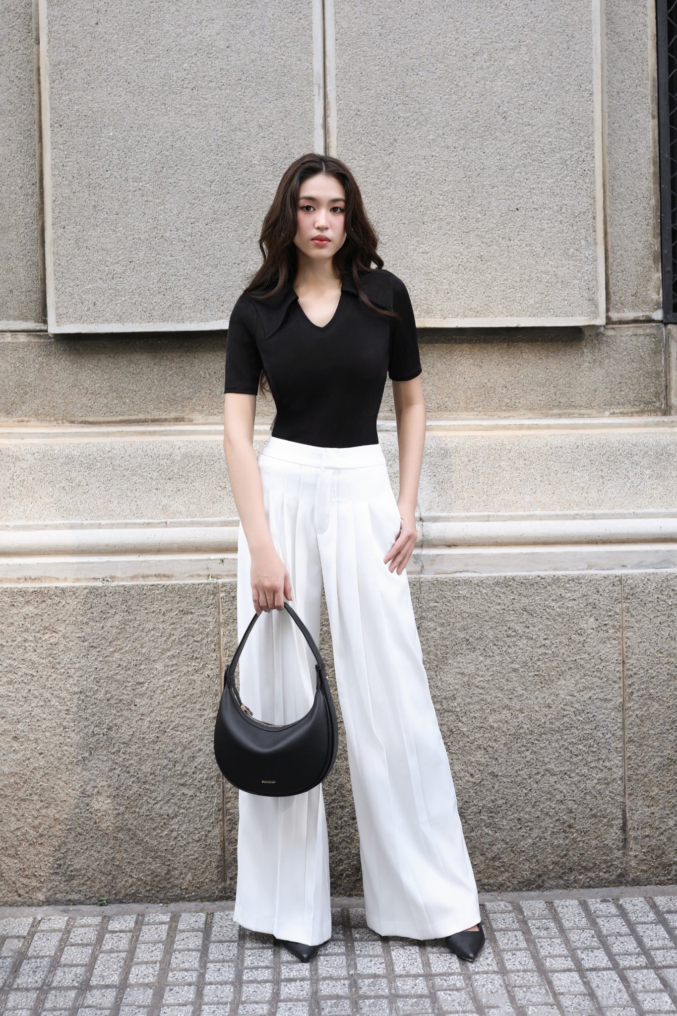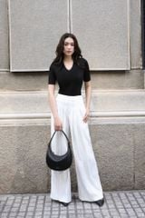Form: Quần culottes ống rộng, xếp 2 ly trước