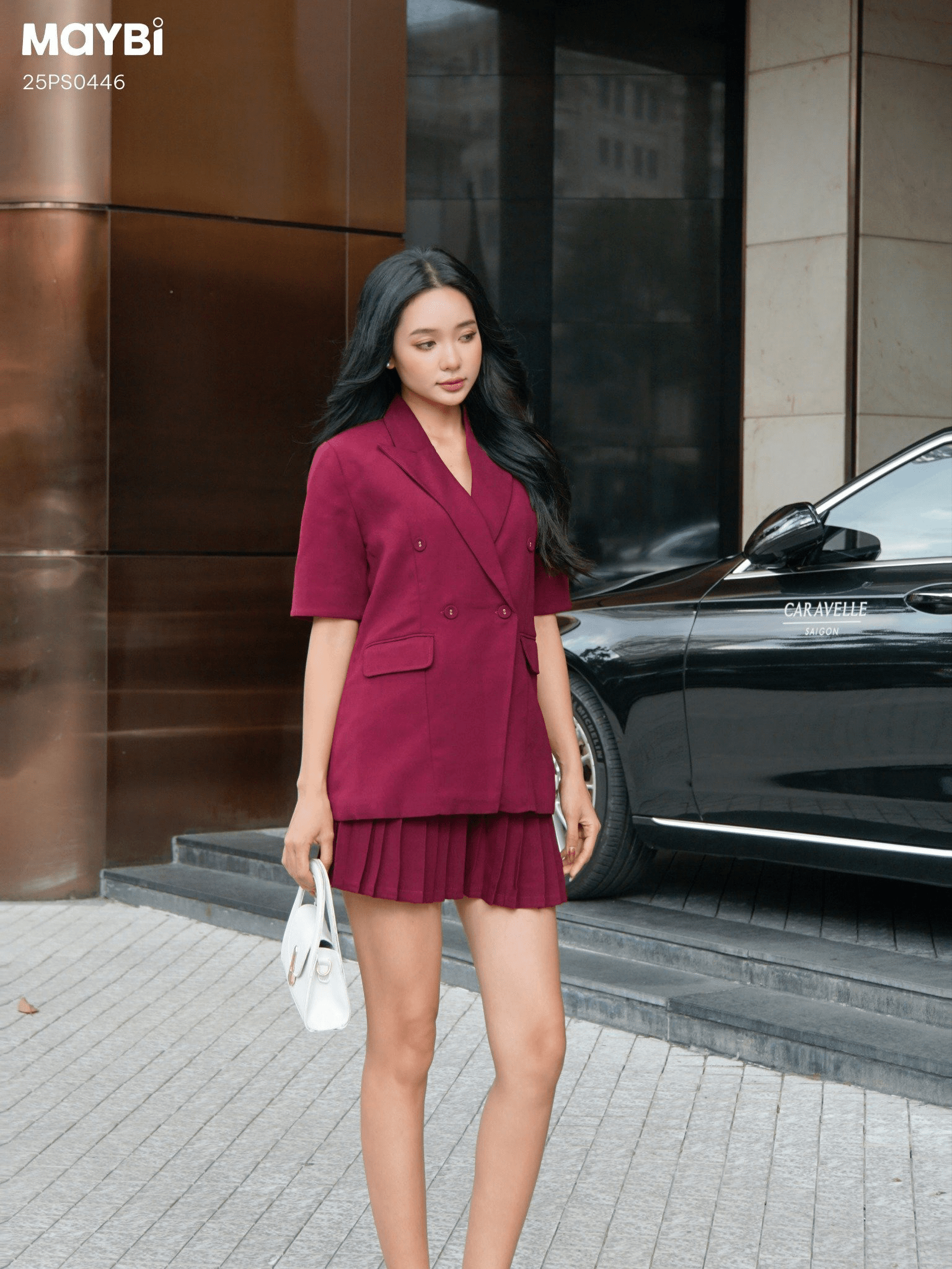 Mô tả kiểu dáng: Set áo blazer, cổ vest, đắp tà gài nút, ngắn tay, túi đắp giả. Chân váy dáng mini xếp ly, xòe, khóa kéo bên sườn,