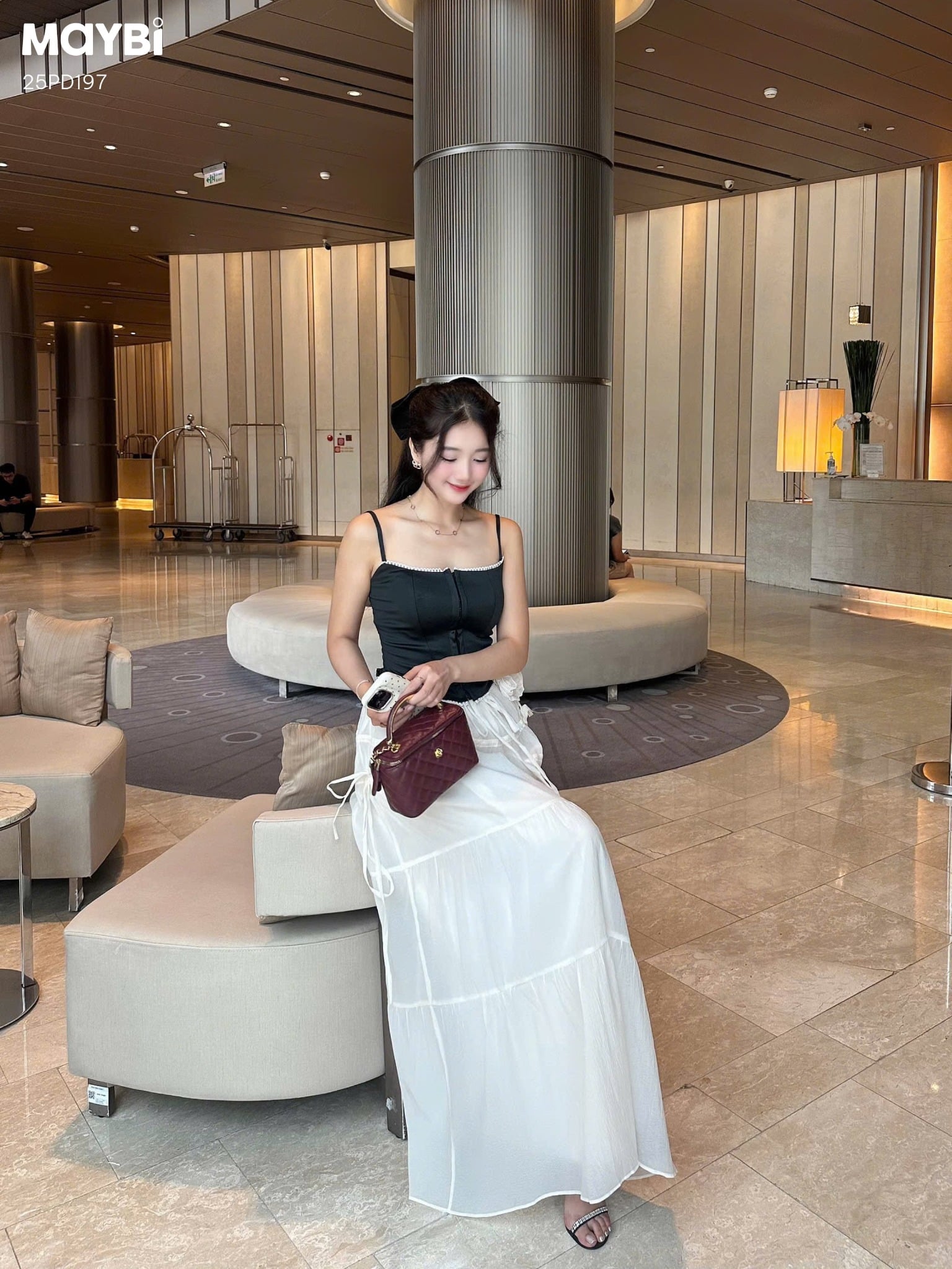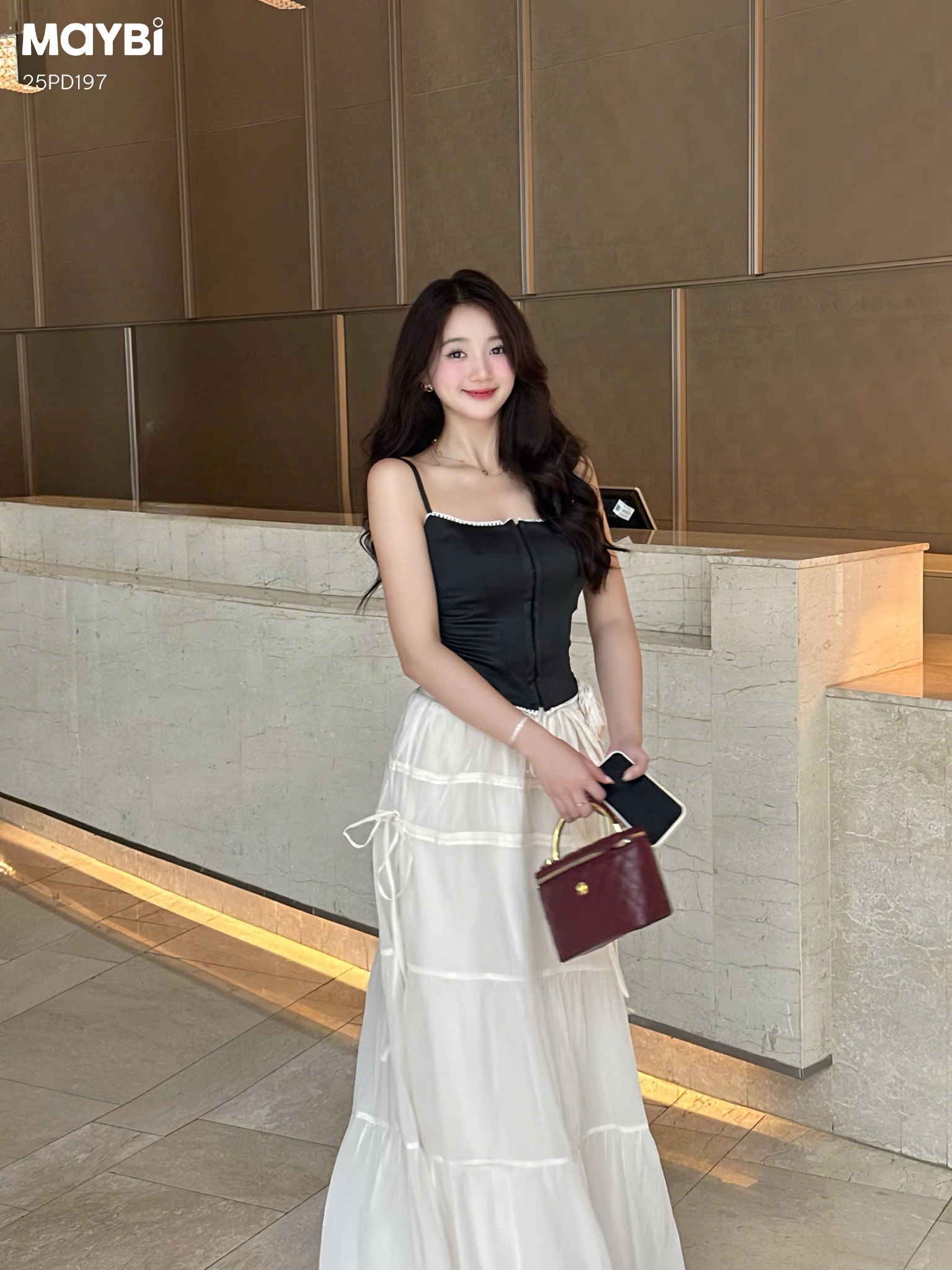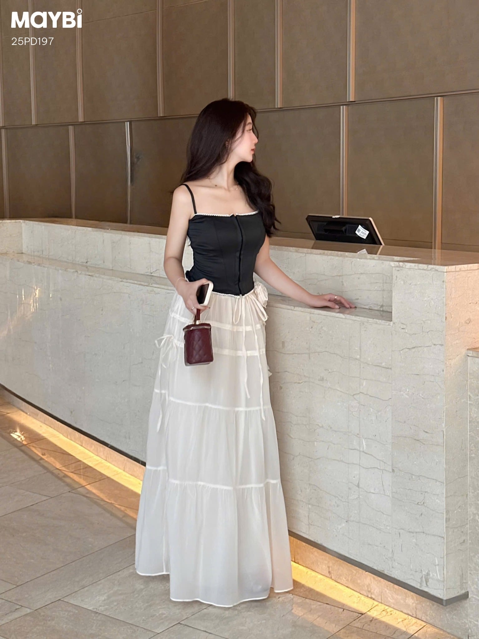 Mô tả kiểu dáng: Set áo corset hai dây khóa kéo sau, chân váy rút nhún xòe dáng maxi.