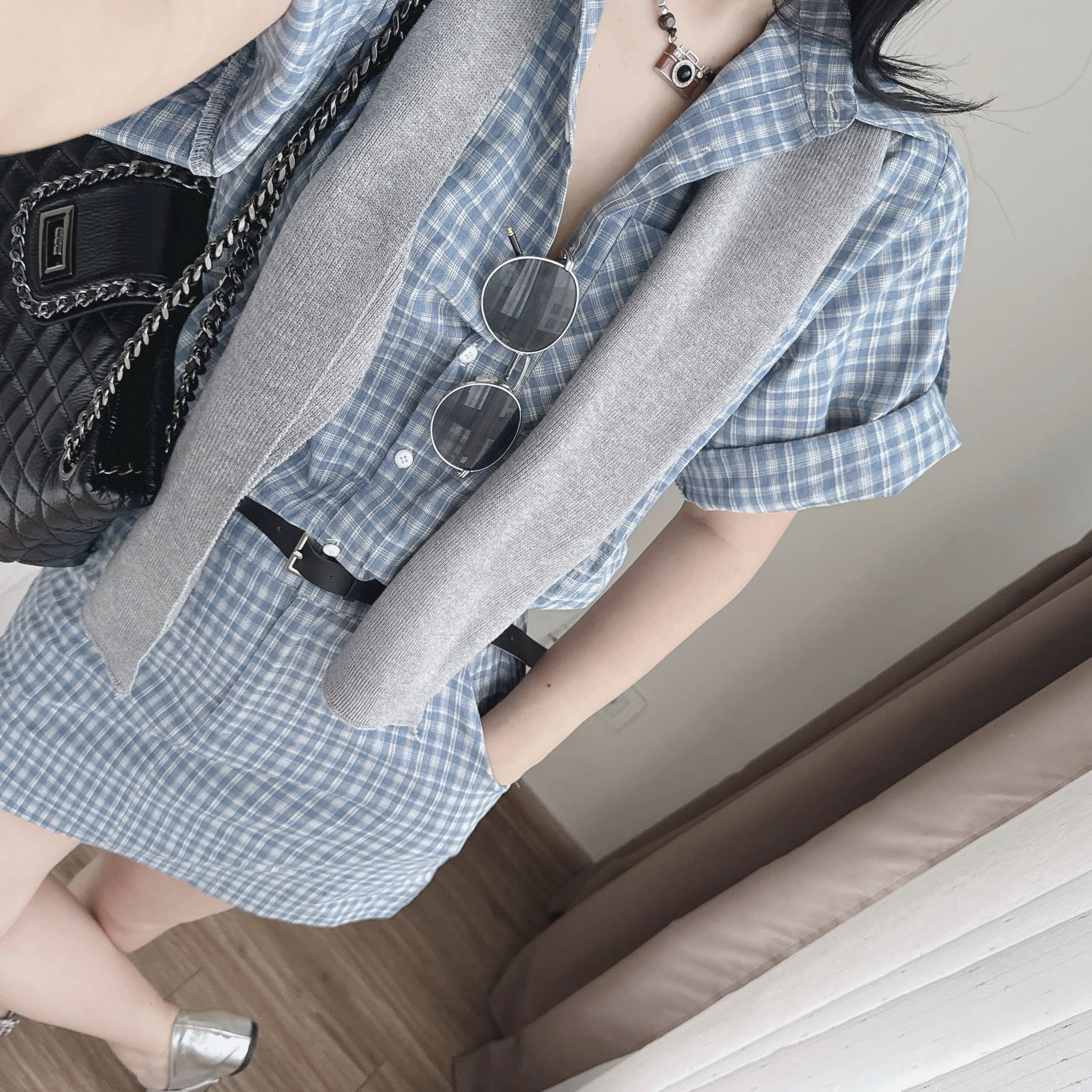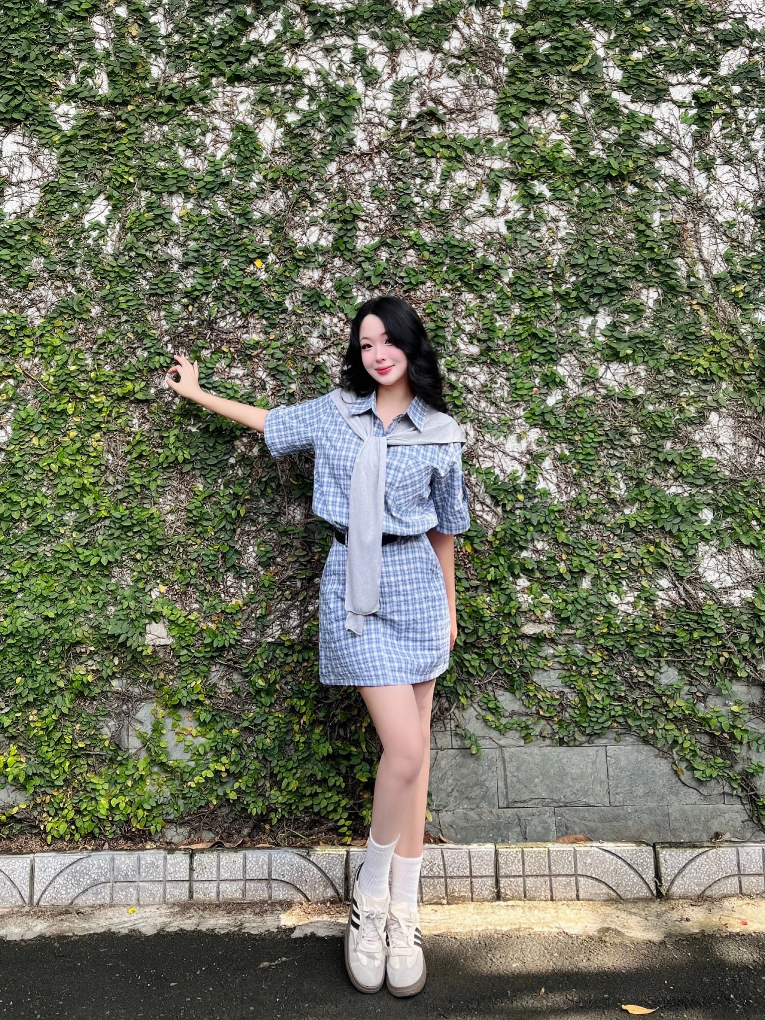 Set áo sơ mi chân váy caro kèm choàng vai