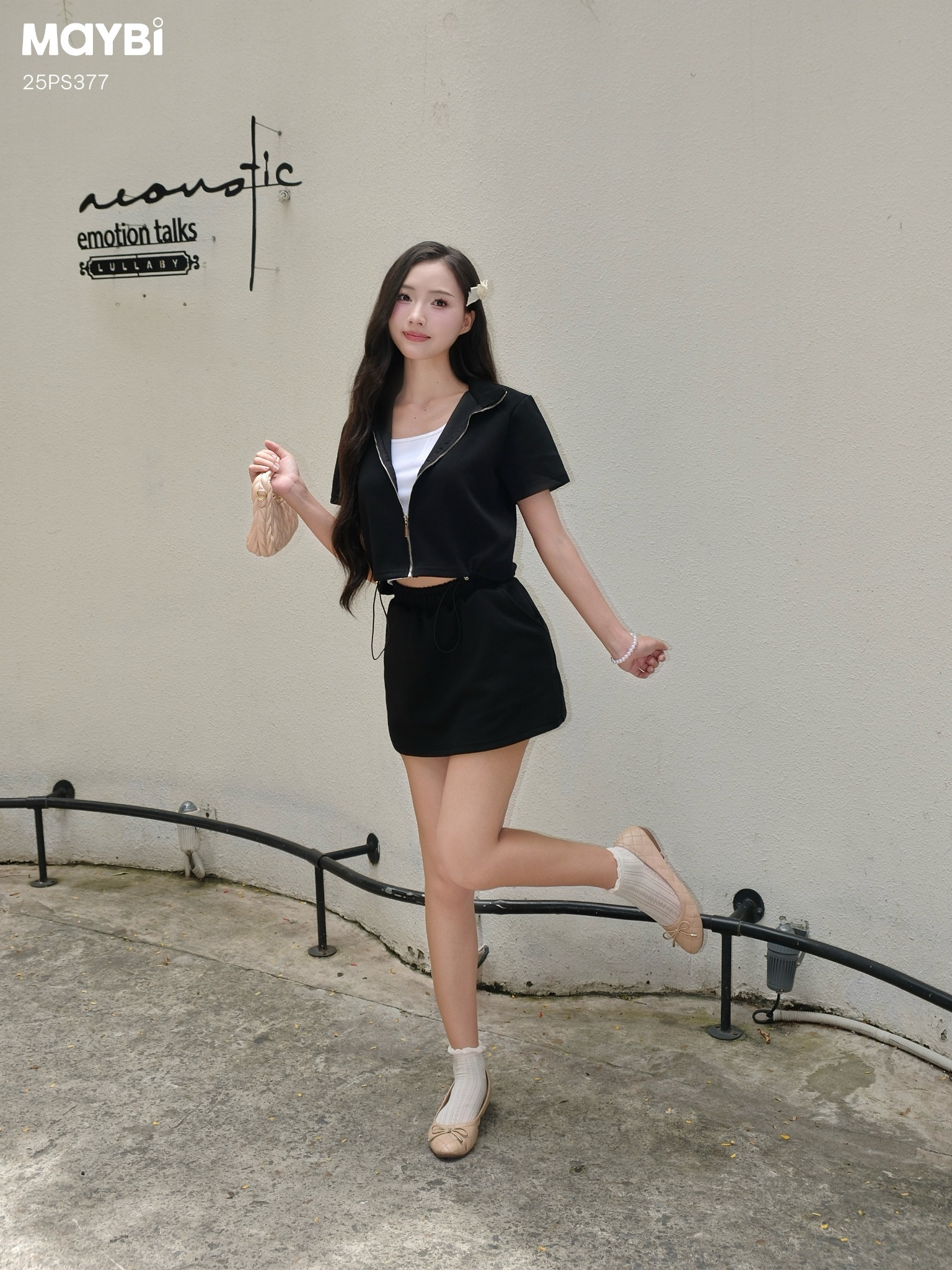 Mô tả kiểu dáng: Set áo kiểu ngắn tay có khóa kéo trước, chân váy A mini kèm áo quây bên trong