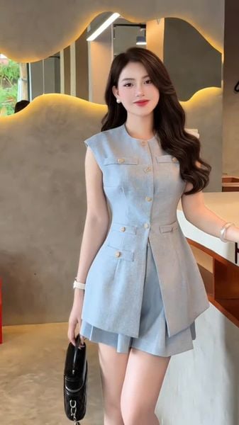 Mô tả kiểu dáng: Set vest ngắn màu xanh nhạt, mang phong cách thanh lịch – năng động – hiện đại, phù hợp cho môi trường công sở, dạo phố hoặc gặp gỡ đối tác.